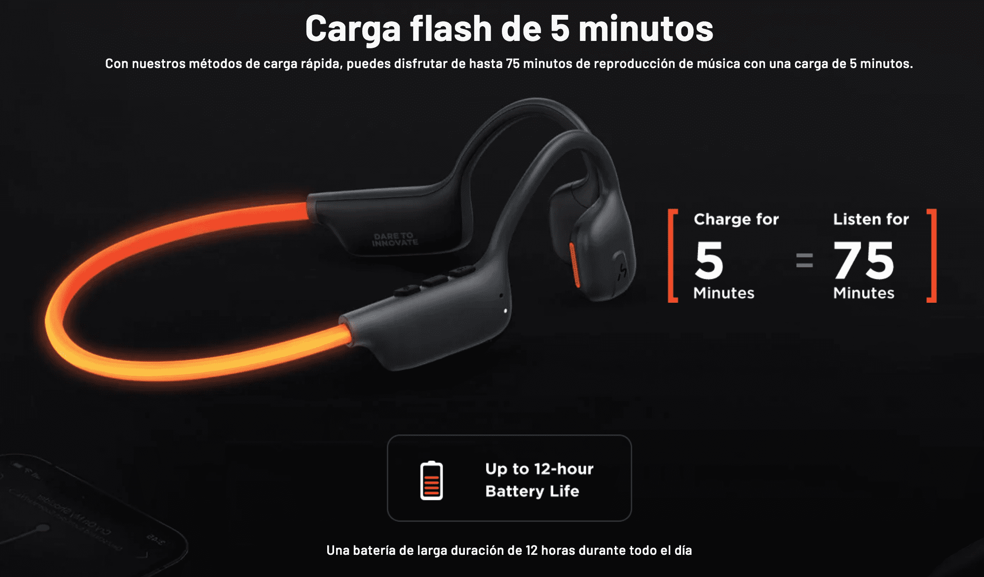 - Carga flash de 5 minutos: con nuestros métodos de carga rápida, puedes disfrutar de hasta 75 minutos de reproducción de música con una carga de 5 minutos.