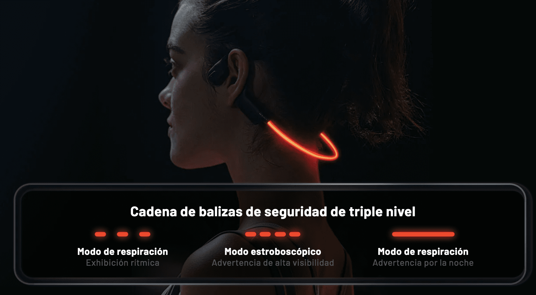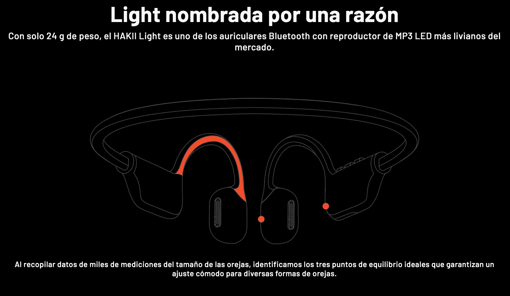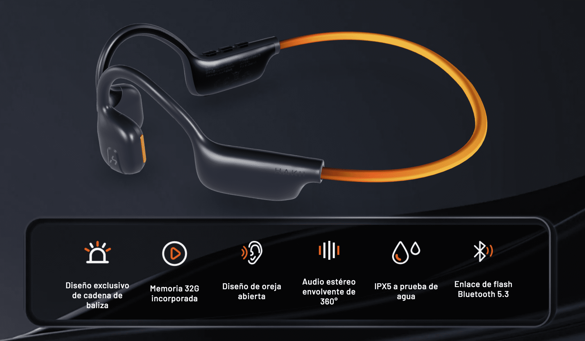 - Antifugas de sonido: Con una cámara de sonido especial y tecnología abTube, los auriculares Bluetooth con reproductor de MP3 HAKII Light LED transmiten el sonido directamente a los oídos sin causar disipación de ondas sonoras. A través de la tecnología de transmisión de sonido direccional, logramos una mejora del 95% en la prevención de fugas de sonido.