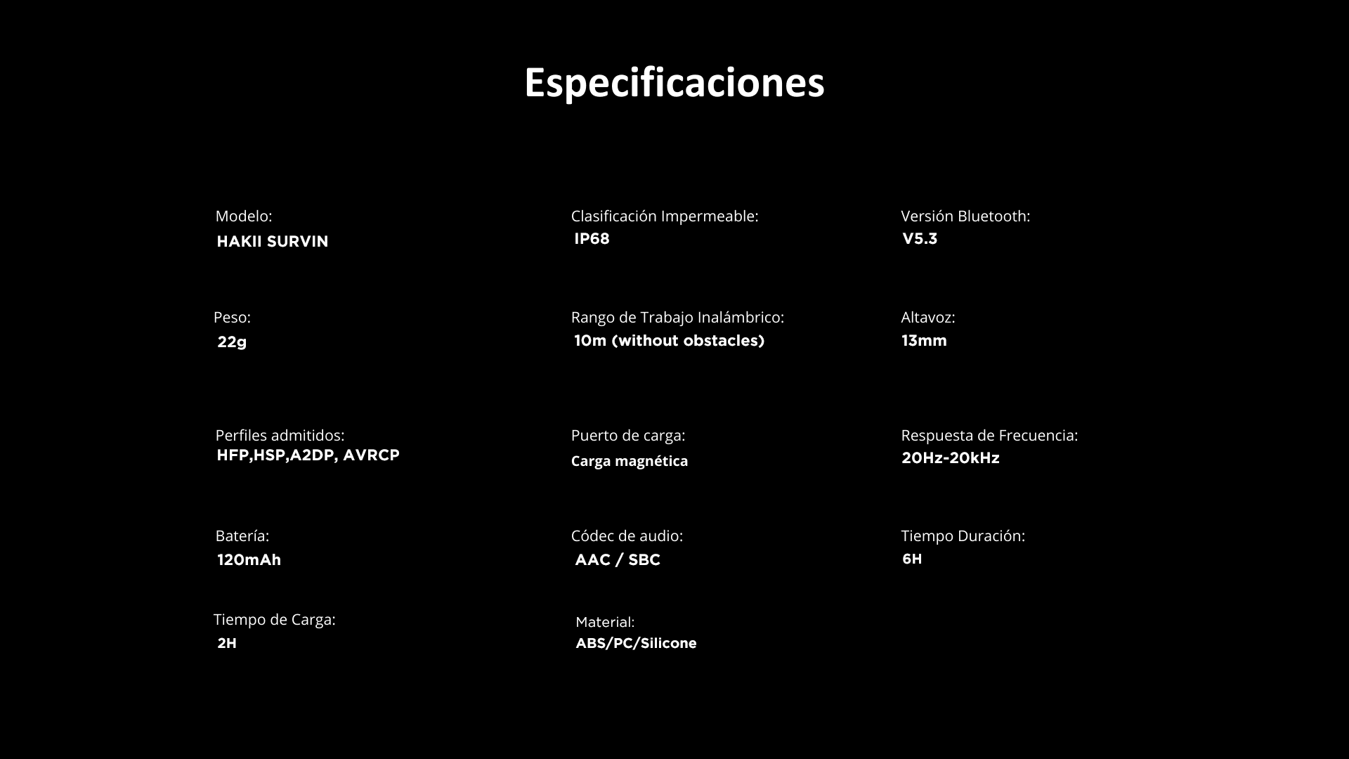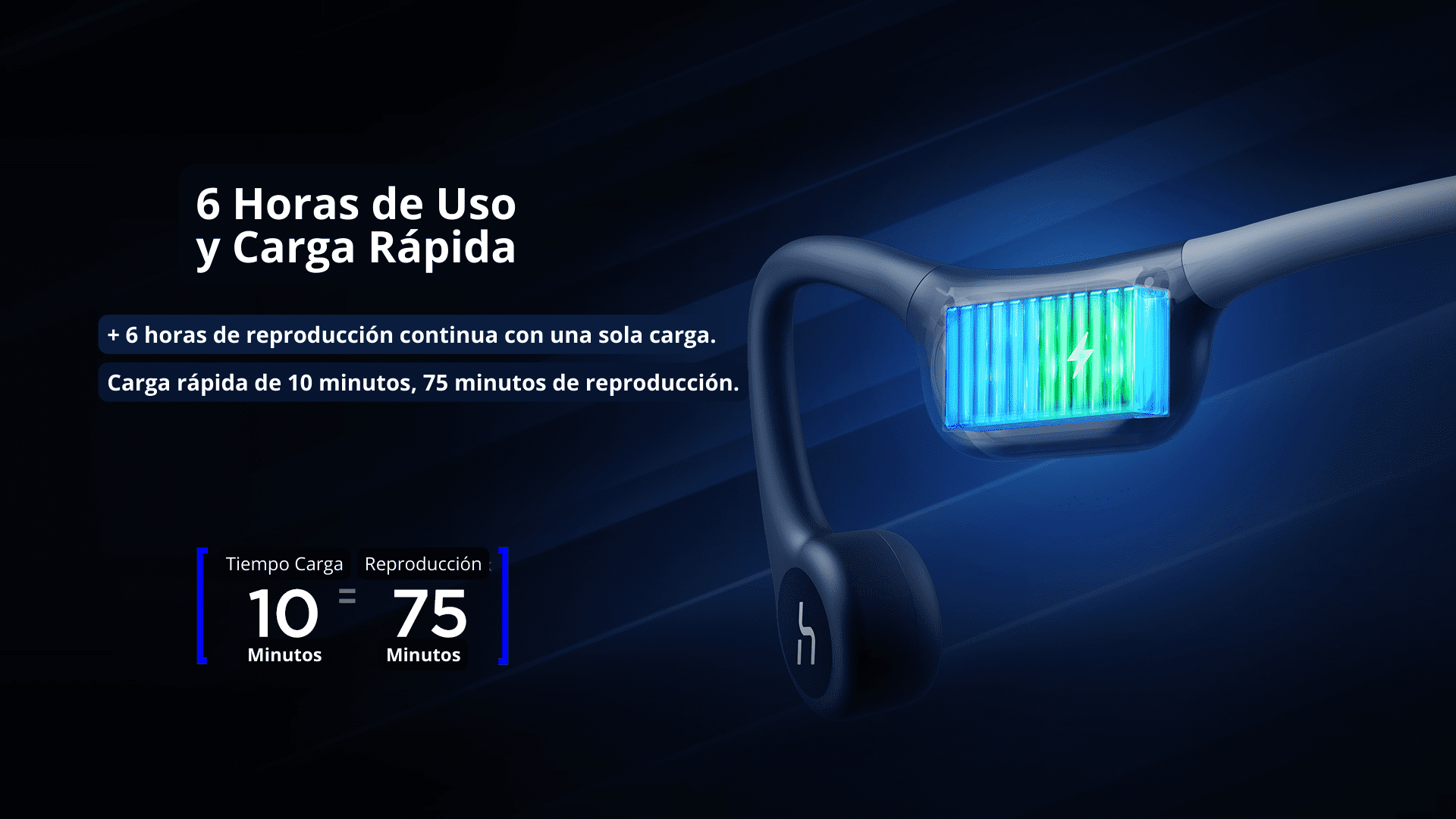 • 6 horas de reproducción y carga rápida: más de 6 horas de reproducción continua con una sola carga. 10 minutos de carga rápida, 60 minutos de reproducción.
