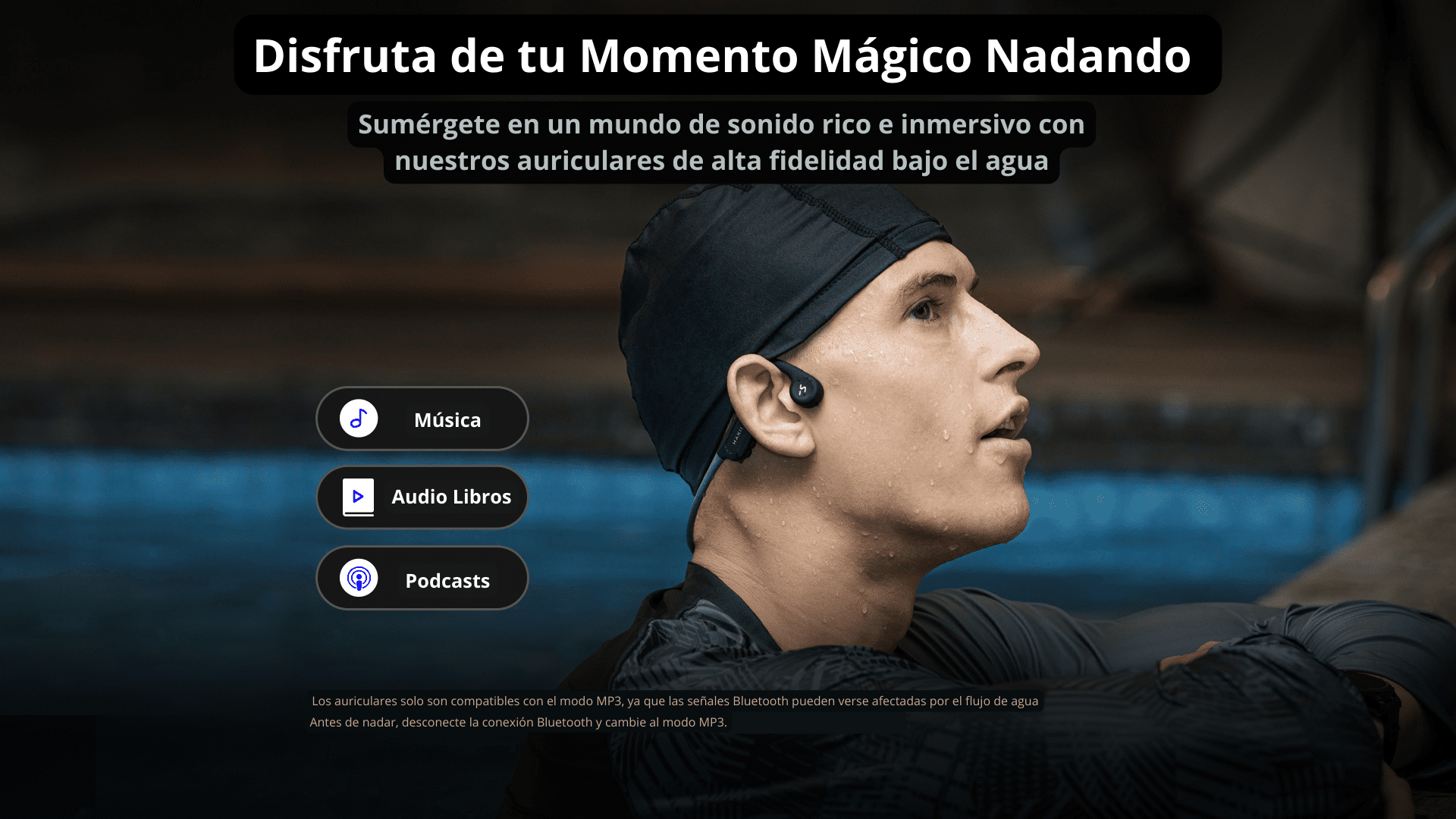 • Disfruta de tu momento mágico nadando y sumérgete en un mundo de sonido rico e inmersivo con nuestros auriculares de alta fidelidad bajo el agua.