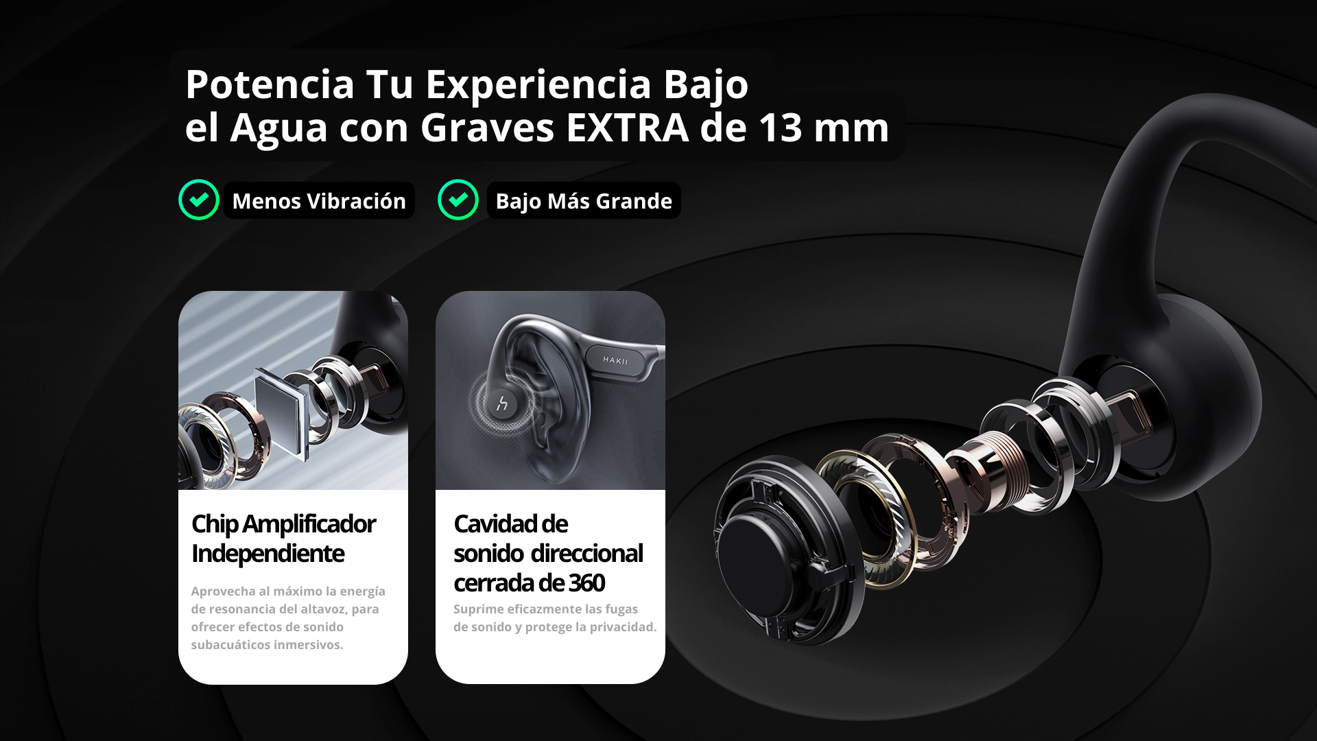 • Chip amplificador independiente que aprovecha al máximo la energía de resonancia del altavoz para ofrecer efectos de sonido subacuáticos inmersivos.