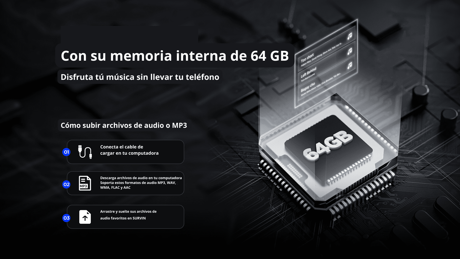 • Con su memoria interna de 64 GB: disfruta de tu música sin llevar el teléfono.